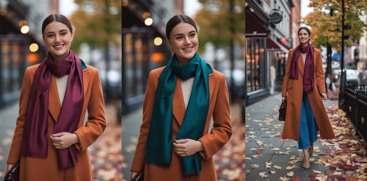 Jeśli zależy Ci na stworzeniu spójnego looku, rozważ szalik w odcieniu zbliżonym do płaszcza. Ciepłe brązy, rdzawe tony czy nawet delikatne pomarańcze będą idealnym dopełnieniem rudego okrycia. Pamiętaj jednak, że odcienie nie muszą być identyczne – lekka różnica nada stylizacji głębi i charakteru.