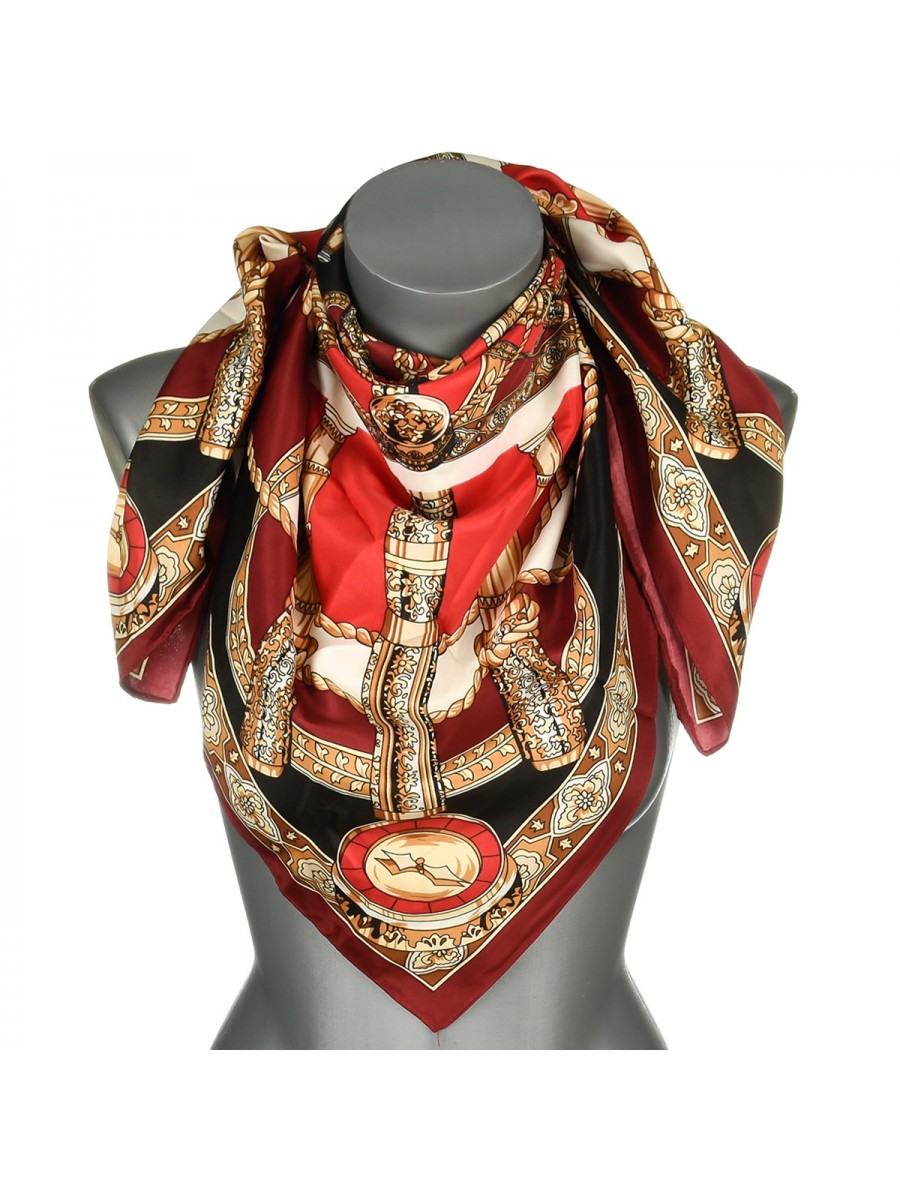 Odkryj chustę damską MDB-28, która doda szyku każdej stylizacji. Jej miękki materiał i gładka faktura sprawiają, że jest przyjemna w noszeniu, a barokowy wzór łańcuchowy z motywami marynistycznymi/zegarowymi przyciąga wzrok.
