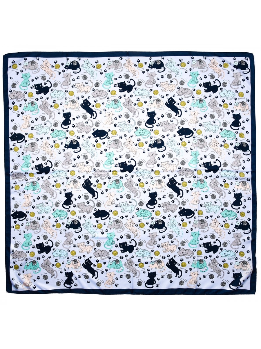 Odkryj chustę damską MDB-44, która doda uroku każdej stylizacji! Ten kwadratowy model z miękkiego materiału zachwyca gładką fakturą i zabawnym wzorem w koty, łapki i kłębki wełny. Idealna jako dodatek do codziennego stroju lub uroczy prezent.