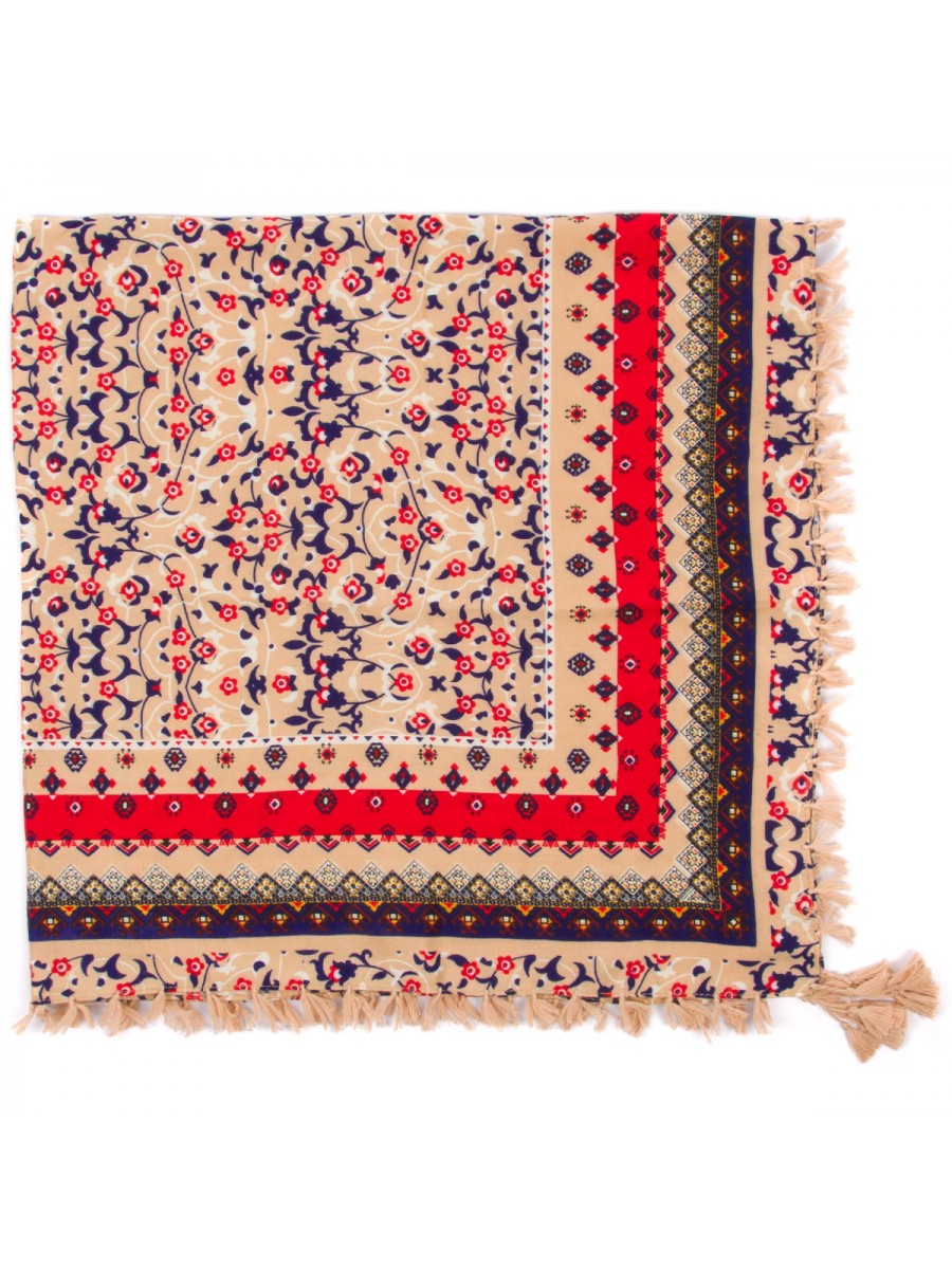 Podkreśl swój indywidualny styl z tą zjawiskową, kwadratową chustą damską. Bogate połączenie kwiatowych i geometrycznych wzorów na beżowym tle przyciąga wzrok i dodaje charakteru każdej stylizacji, od codziennej po wakacyjną.