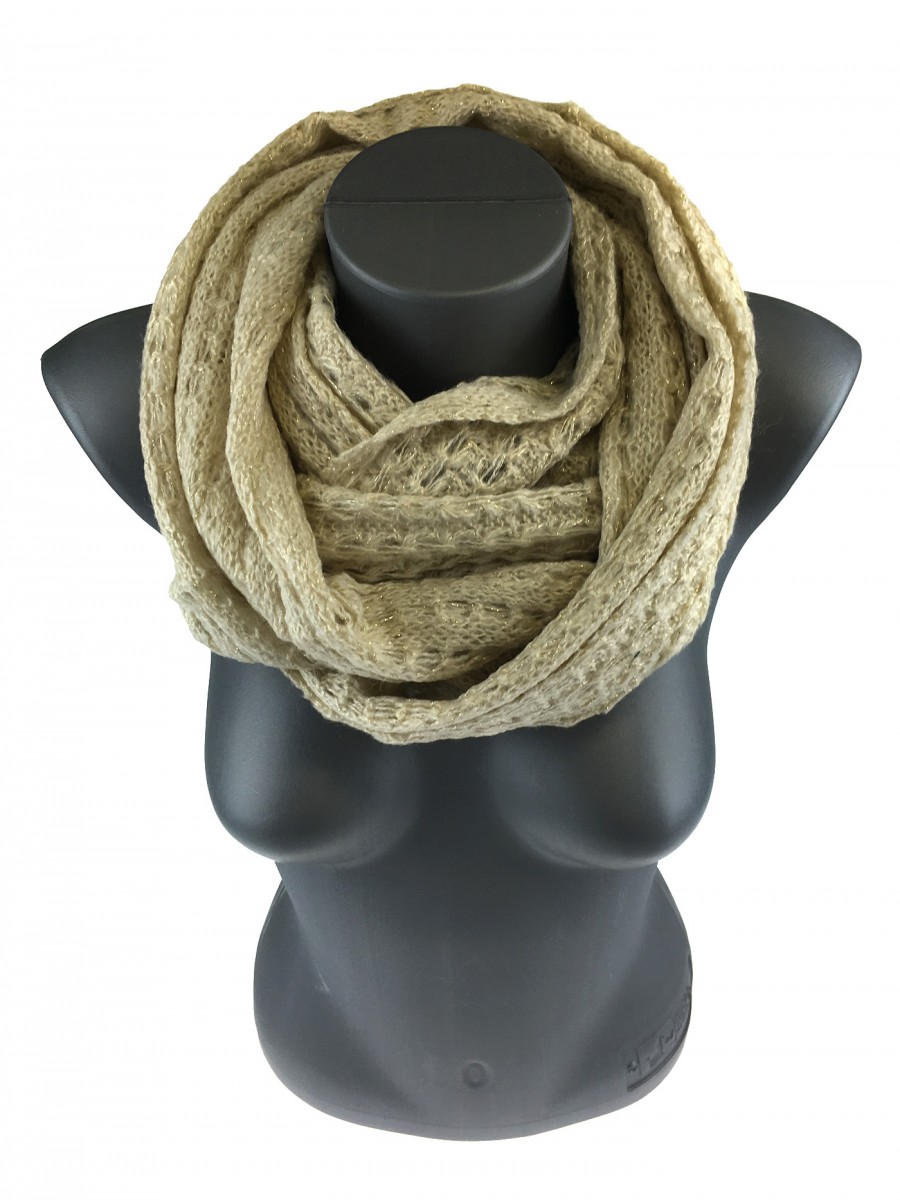 Odkryj lekkość i styl z tym beżowym kominem damskim, który doda blasku każdej stylizacji. Ażurowe dzianie z brokatową nicią sprawia, że ten szalik damski jest nie tylko miękki, ale i efektowny.