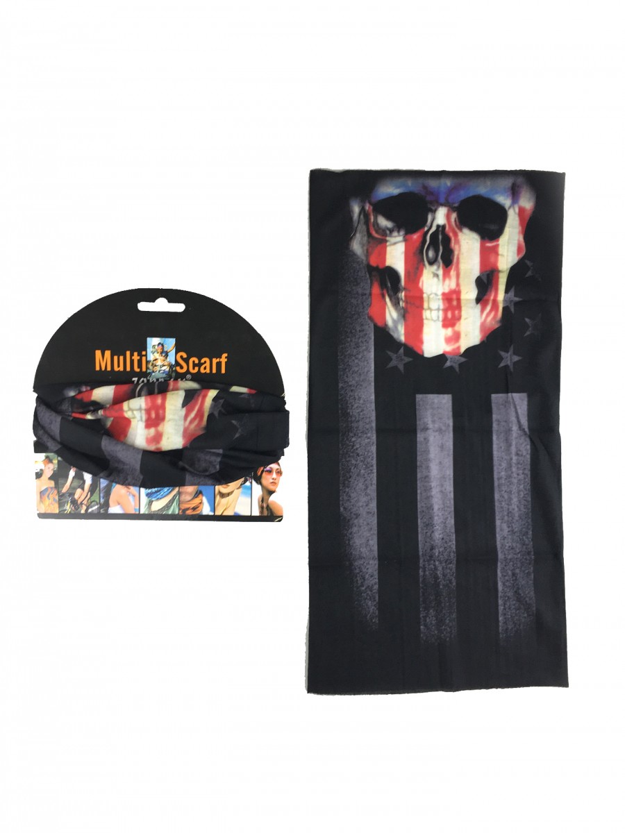 Odkryj chustę Multi CZ-25 – Twój nowy, niezawodny towarzysz na każdą przygodę! Ta czarna chusta wielofunkcyjna z nadrukiem czaszki i flagi amerykańskiej to idealny wybór dla każdego, kto ceni styl i funkcjonalność. Sprawdzi się jako komin na twarz, chusta motocyklowa czy sportowa.