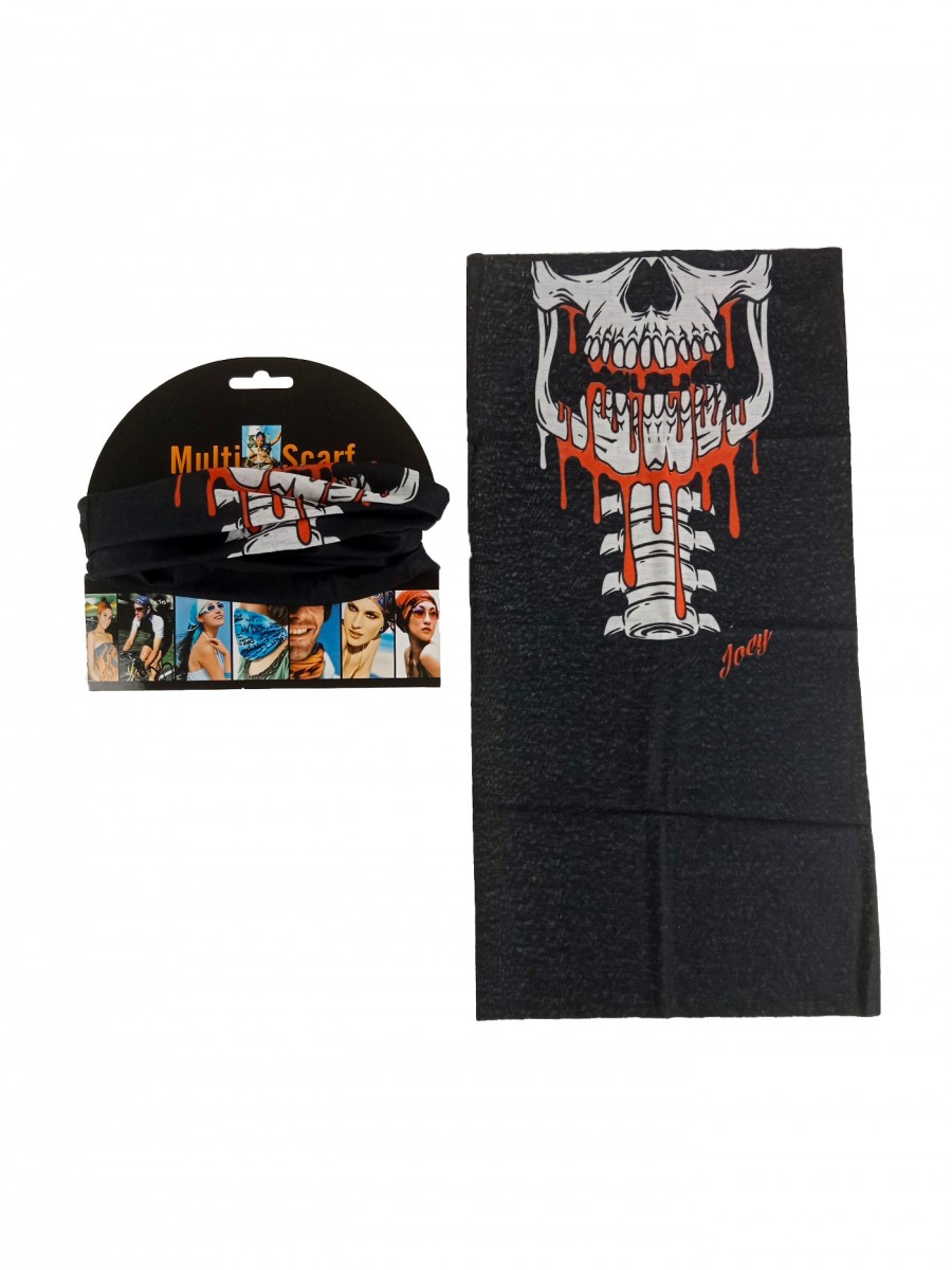 Pokaż swój styl z tą czarną chustą wielofunkcyjną! Z odważnym nadrukiem czaszki i kropli krwi, to idealny dodatek dla każdego, kto ceni oryginalność. Sprawdzi się jako komin na szyję, bandana motocyklowa czy chusta sportowa.