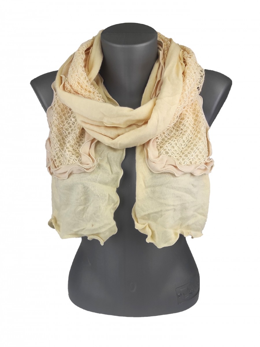Odkryj urok tego beżowego szalika damskiego, który doda Twojej stylizacji subtelności. Jego ażurowy wzór i marszczenia tworzą delikatny, a zarazem wyrazisty akcent.