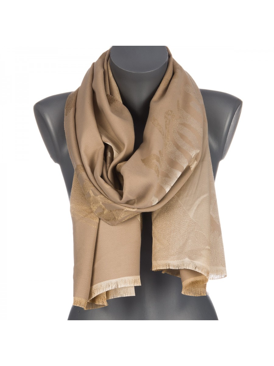 Odkryj szalik damski ST-30, który doda szyku każdej stylizacji. Ten miękki szal beżowy z subtelnym wzorem z logo i frędzlami to idealny dodatek do ubrania na co dzień.